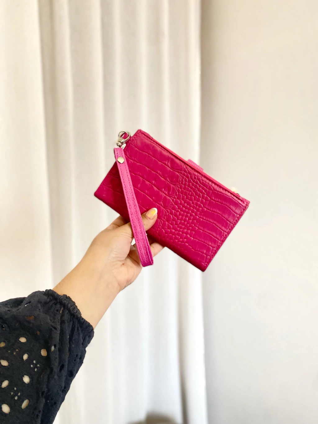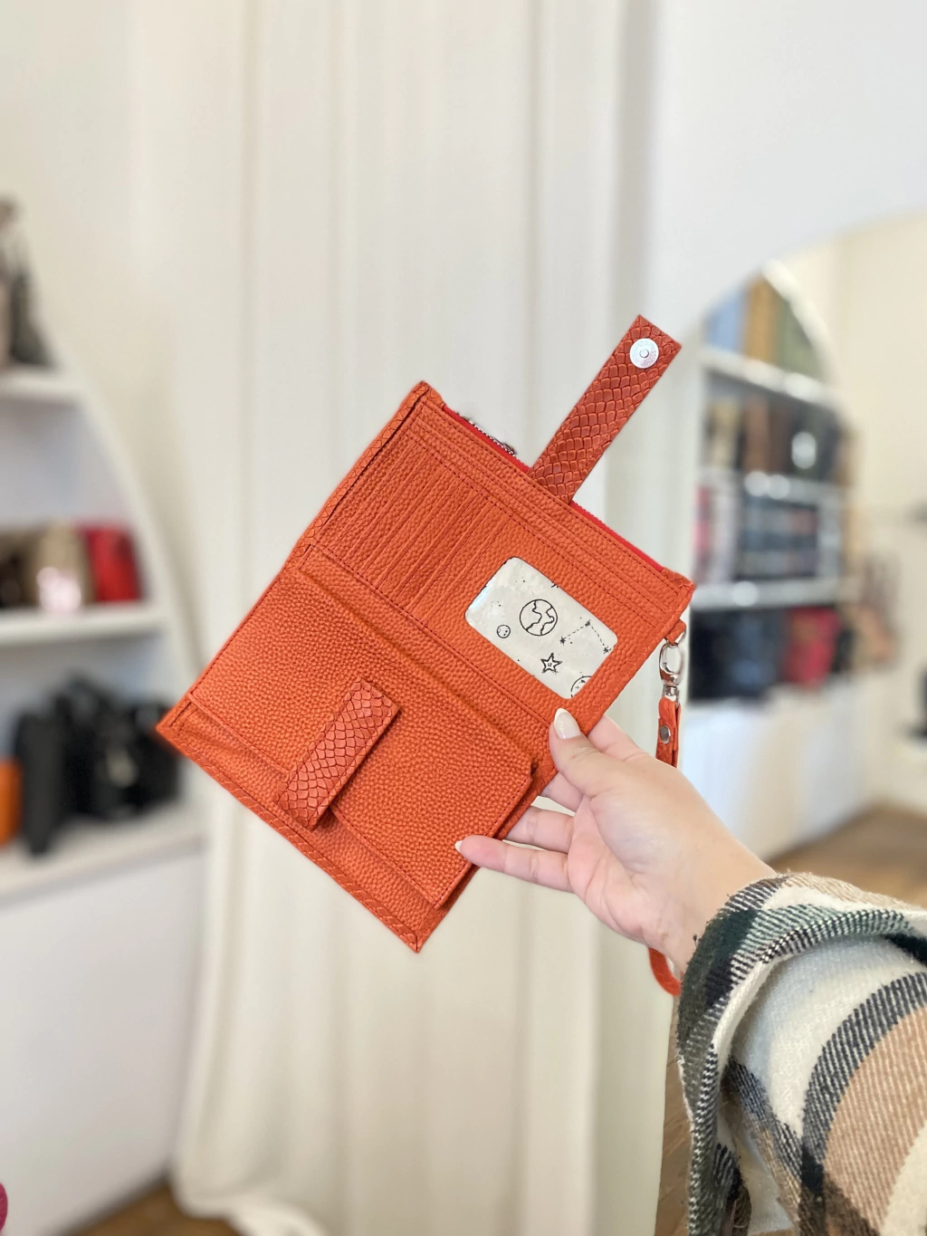 Confeccionada 100% en cuero, apertura con presilla de iman. Cuenta con correa corta de mano para llevar, interior con multiples compartimentos para tarjetas y efectivo, lugar para llevar el celular, bolsillo con cierre, ventana para foto y mas.