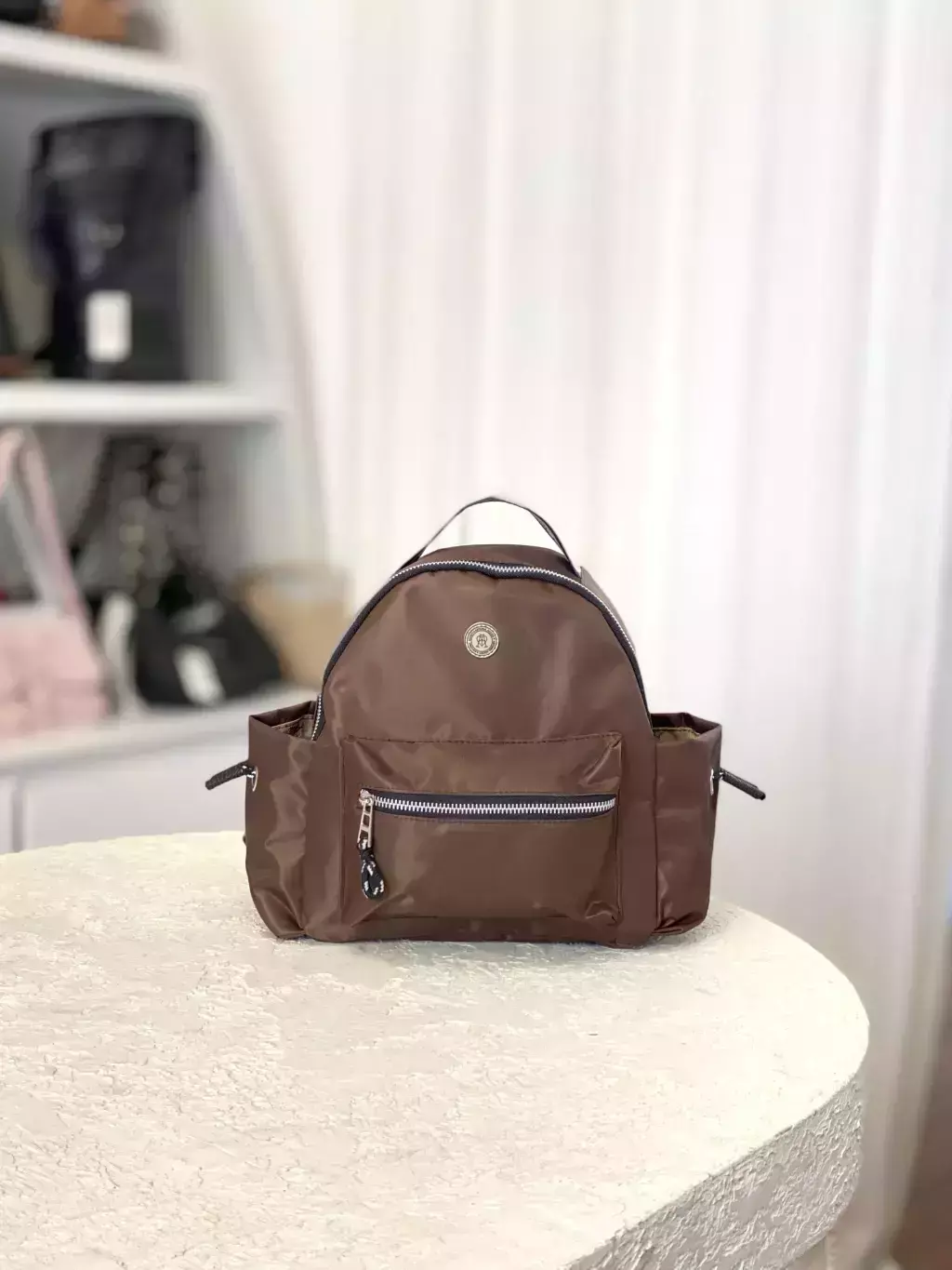 Mochila Sofi: Confeccionada en tela impermeable, forrada con tela. Tiene cierre metálico para su acceso.