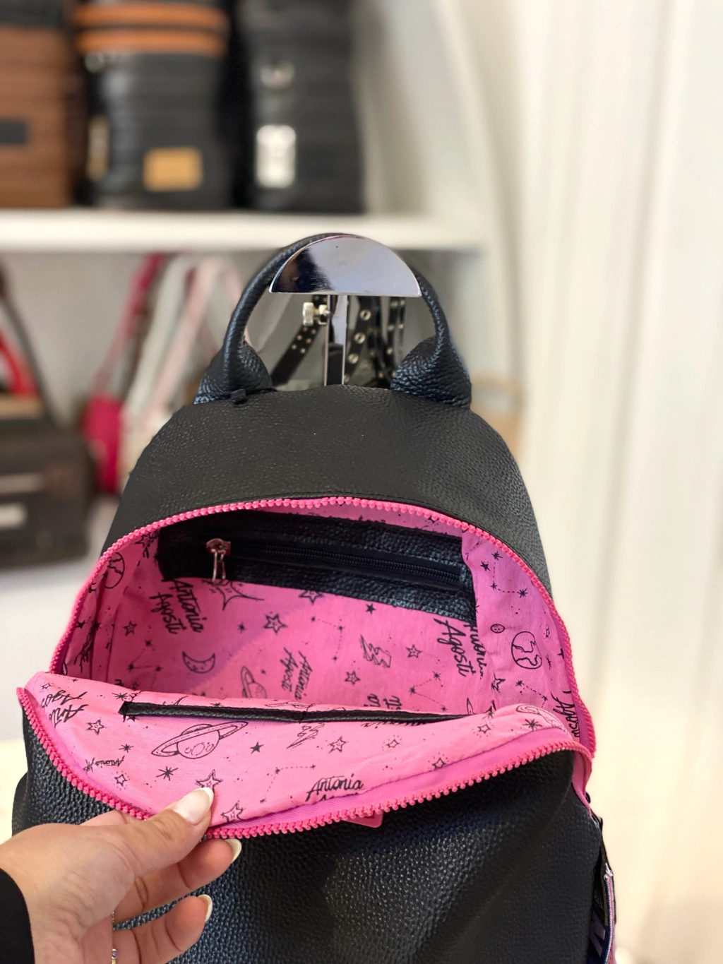 Interior forrado con tela personalizada y posee un bolsillo con cierre. Correas en espalda de cinta sublimada regulable, y manija corta de cuero para cargarla de mano.