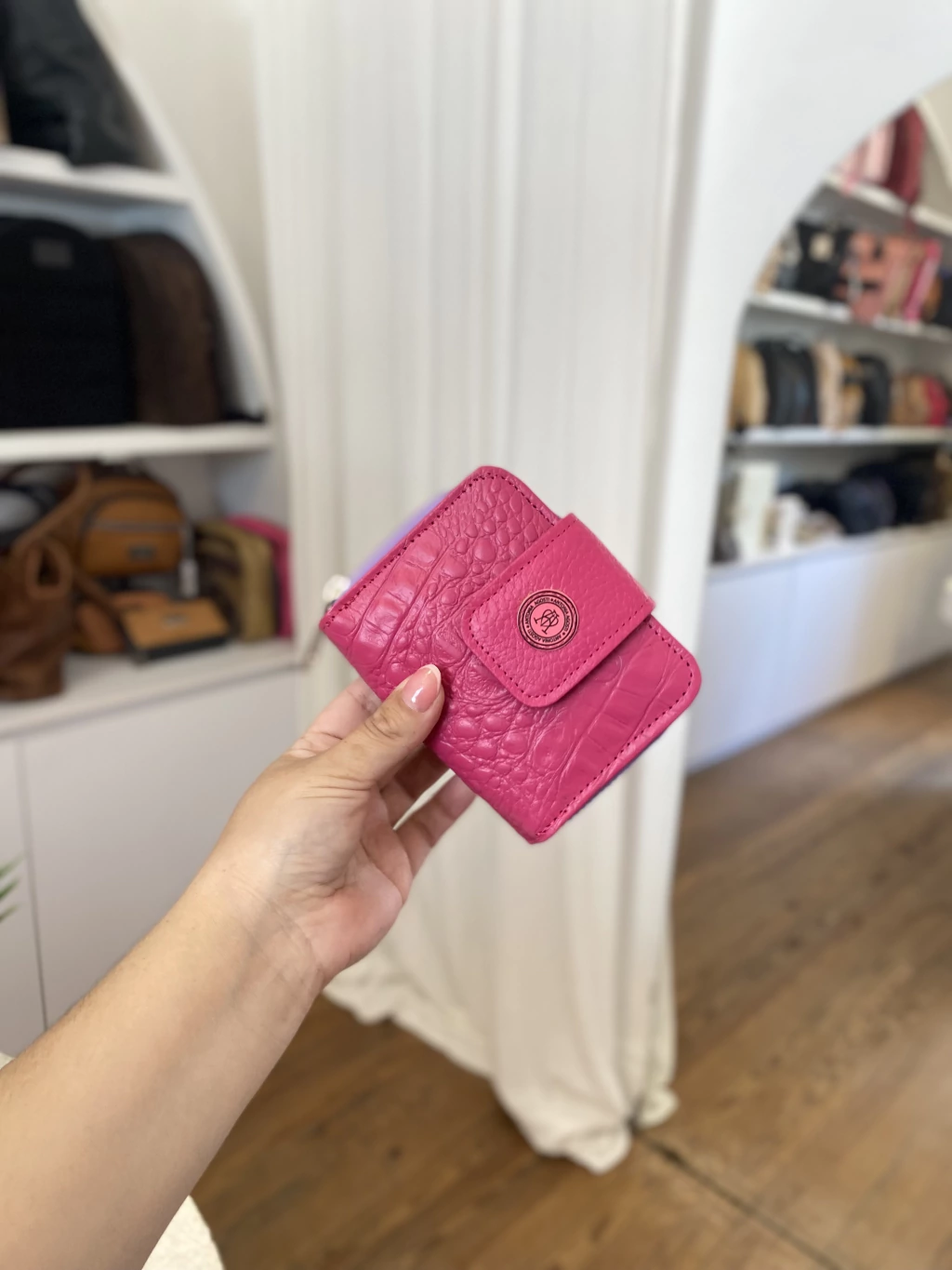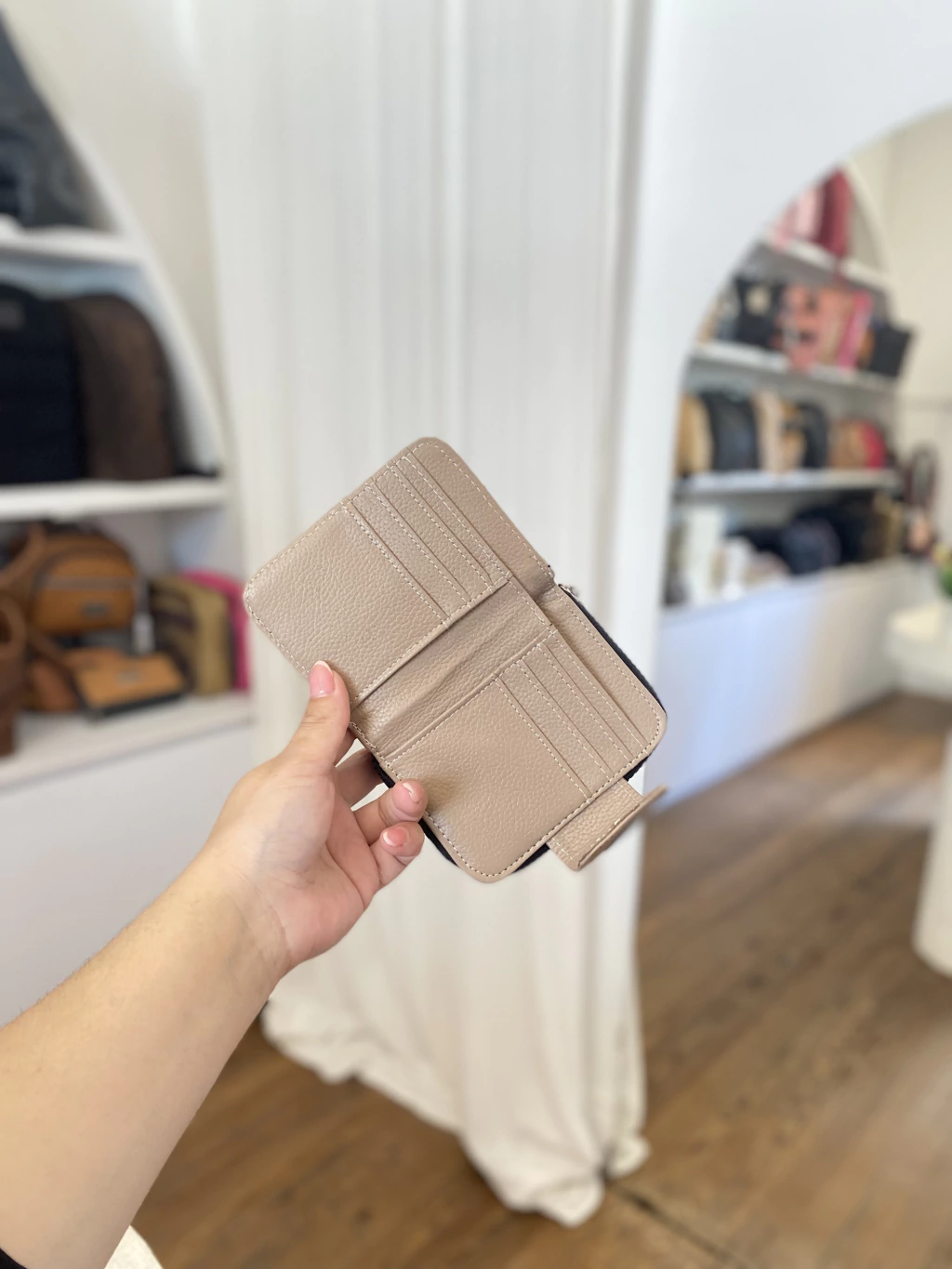 Posee doble apertura, una es acordeon con cierre, y la otra es apertura total con broche de iman, con mucho lugar para guardar tarjetas, documentos y dinero en efectivo.