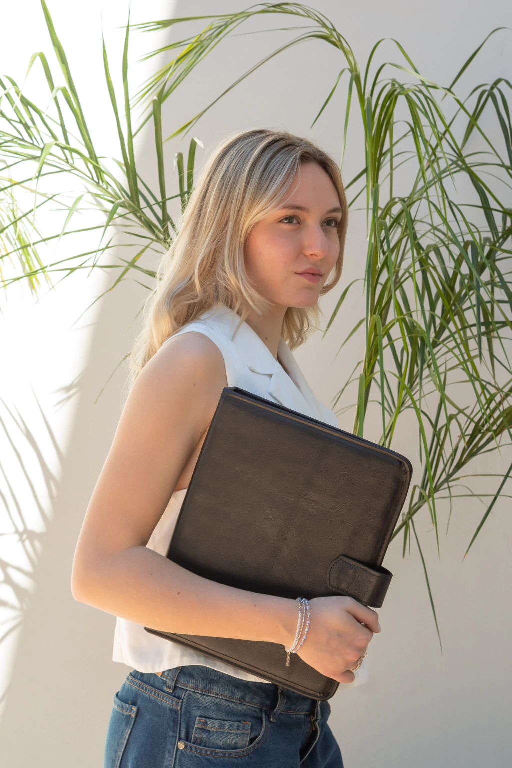 Agenda y carpeta A4, pensada para quienes necesitan espacio y organizacion en la misma medida. Confeccionada en cuero de alta calidad, conviertiendose en un complemento ideal para oficina, estudio o reuniones importantes.